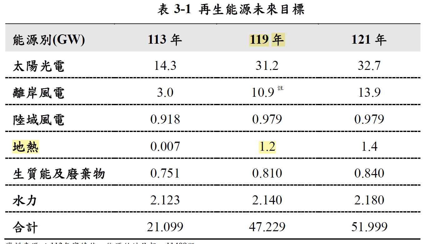 民國113年度「全國電力資源供需報告」就2030年的地熱目標,卻退縮到1.2GW。圖片來源:擷取自民國113年度《全國電力資源供需報告》