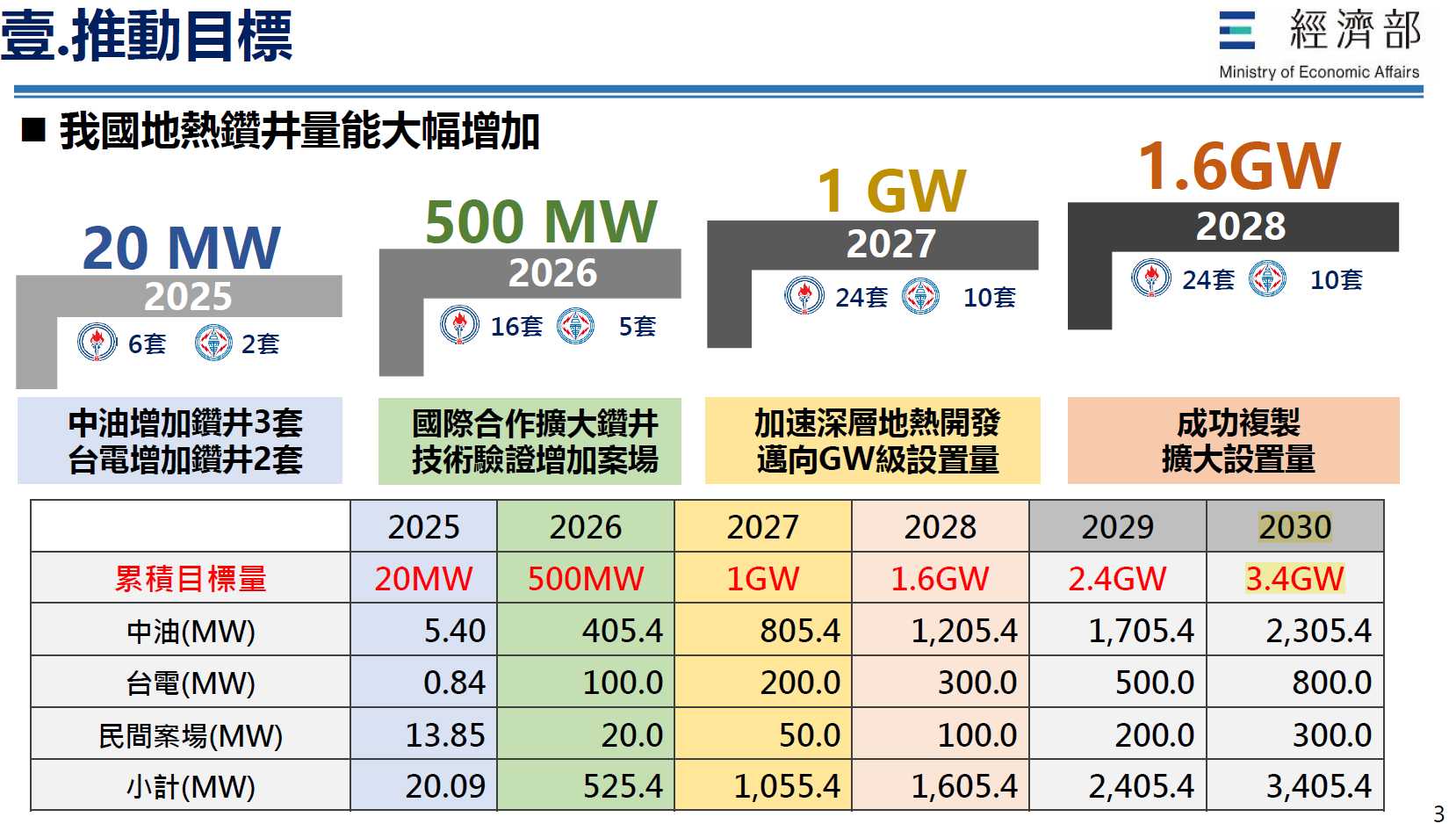 經濟部能源署曾於2024年11月提出2030年地熱累積目標量3.4GW。圖片來源:擷取自經濟部能源署《地熱能推動進度》簡報