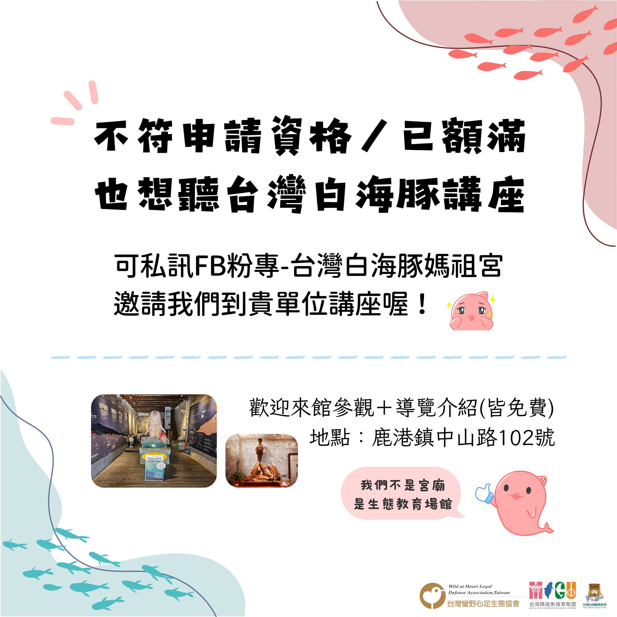 🥳講座-台灣白海豚外送平台,長期開放報名!全台學校及社區都可申請,詳情請見報名表單:https://forms.gle/pnkMAn2wGFKRTNqk6