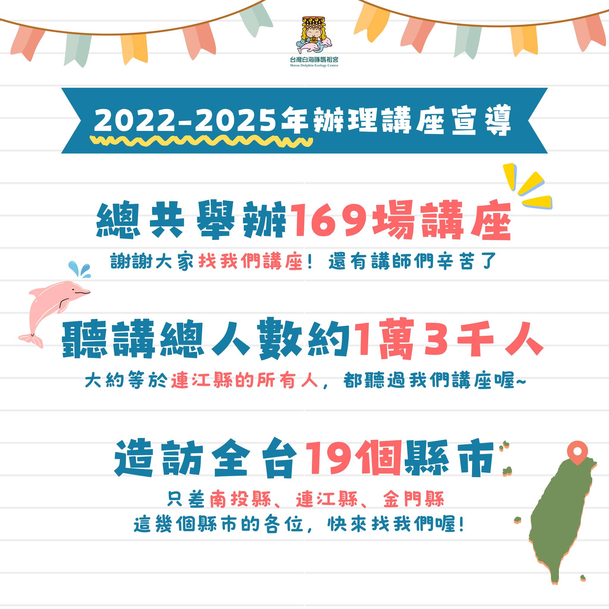 然而台灣白海豚外送平台-講座,已經持續好幾年了!從2022~2025年至今總共169場,約1萬3千人聽講座(跟連江縣人口差不多喔!),全台只剩南投、金門、連江縣還沒造訪,這些地方的單位,快來找我們吧!