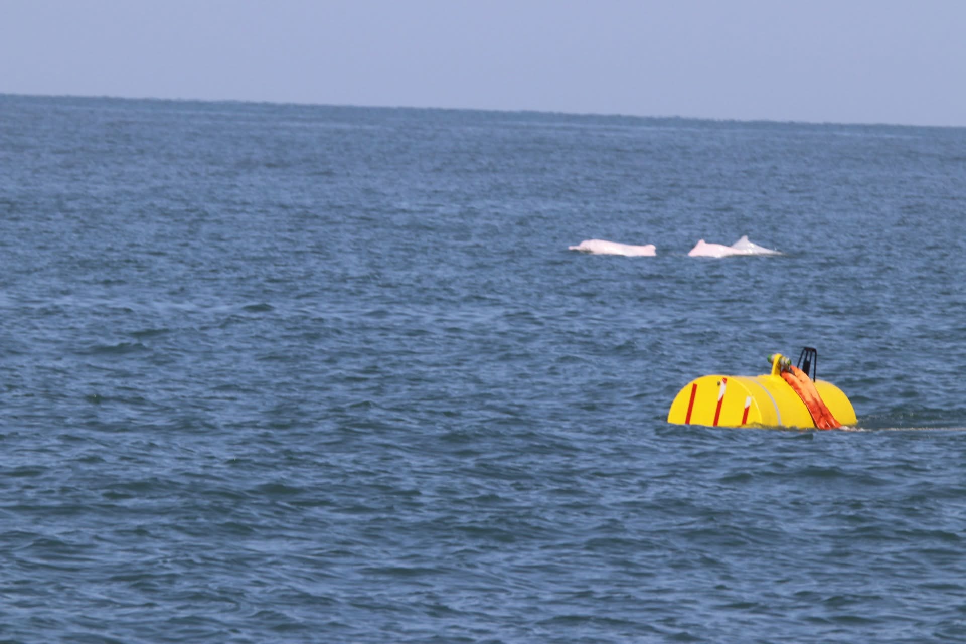 沃旭能源特來聯繫,為我們說明黃色浮球的構造及用途,黃色浮球與浮球之間並無相連,每個浮球相隔200公尺,白海豚可以從中間穿過,浮球下為繩索及錨,使浮球不會漂流,並無其他設備或網具,浮球的用途為標示海纜鋪設範圍,會隨海纜鋪設進度而移動這些浮球。
